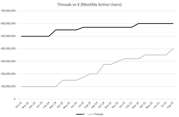 Como você pode ver neste gráfico, o Threads está rapidamente ganhando X em atividades mensais e está claramente no caminho para se tornar o líder na corrida social em tempo real.