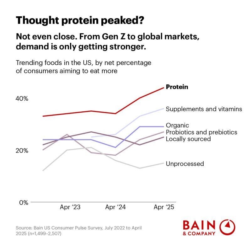 Só nos EUA, uma pesquisa da Bain & Company indica que 44% dos americanos pretendem aumentar seu consumo de proteína até 2025.